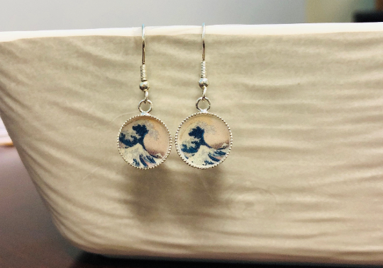 A beautiful image of The Great Wave off Kanagawa by Katsushika Hokusai is set with epoxy resin. These earrings are perfect for an art lover. The drop is 13mm round silver-plated brass.