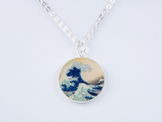 A beautiful image of The Great Wave off Kanagawa by Katsushika Hokusai is set with epoxy resin. The necklace has a lobster claw clasp and is available in 16 or 18 inches in silver-finished brass and in 30 inches in stainless steel. The necklace is perfect for an art lover.