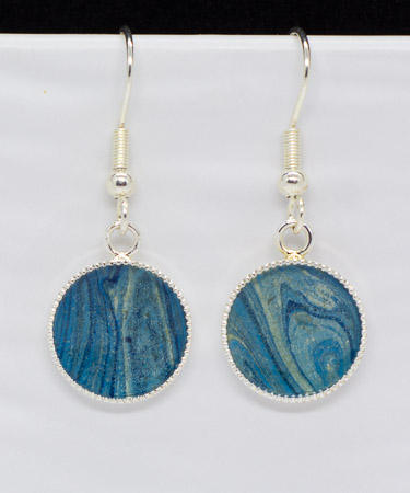 A striking pair of earrings made with high quality marbled Napalese Lokta paper covered with epoxy resin. The pattern is veins of blue flowing against a cream colored background. The paper was crafted by hand in Nepal from the bark of the Lokta Bush. The drop is 13mm round silver-plated brass.