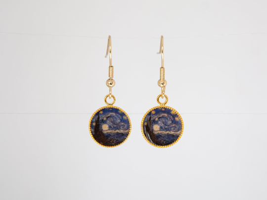 A beautiful image of Vincent Van Gogh’s Starry Night is set with epoxy resin. These earrings are perfect for an art lover. The drop is 13mm round gold-plated brass.