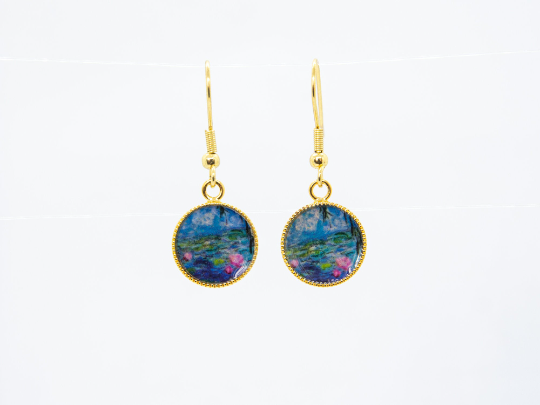 A beautiful image of Water Lilies by Claude Monet is set with epoxy resin. These earrings are perfect for an art lover. The drop is 13mm round gold-plated brass.